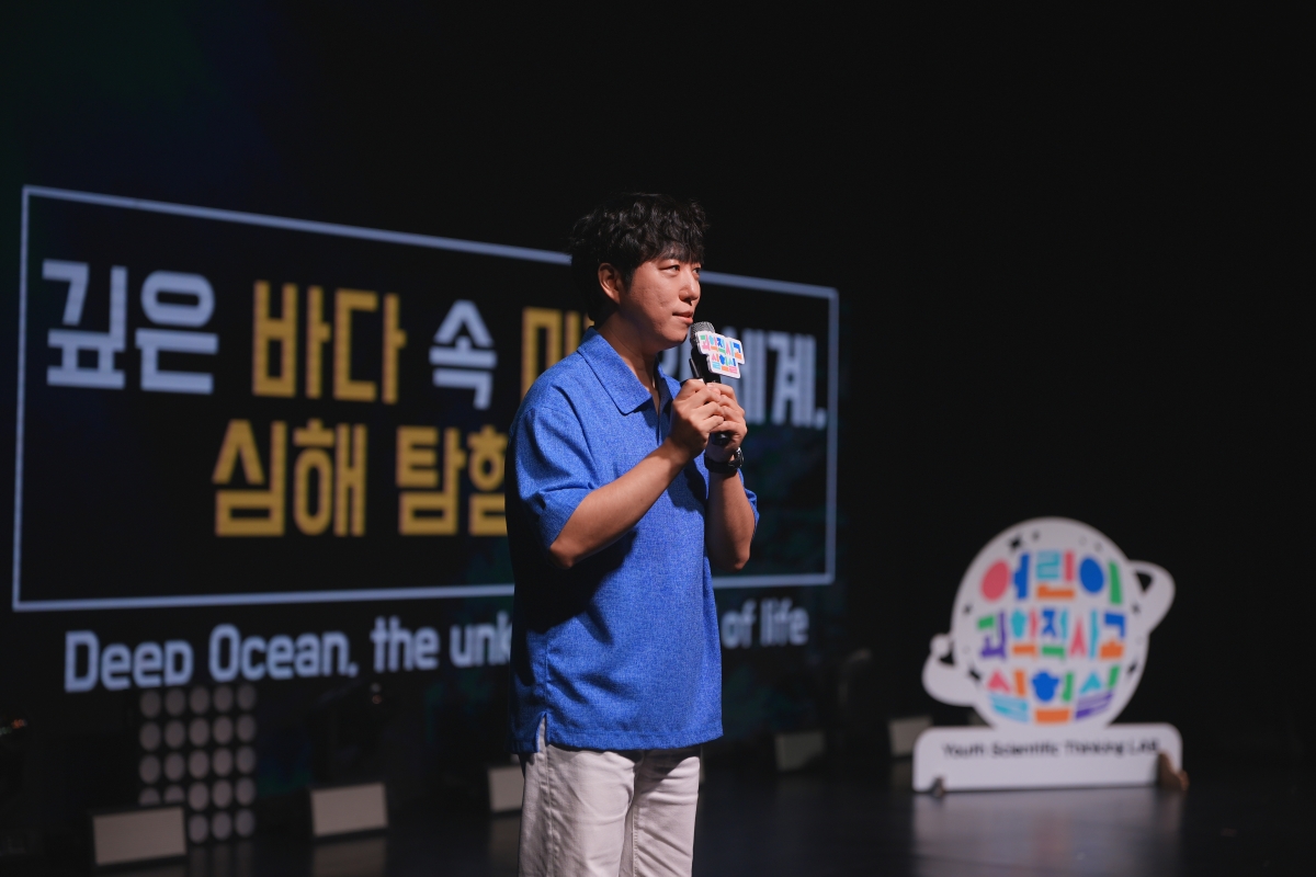 ▲ 21일 서울 강남구 가빈아트홀에서 펼쳐진 '제3회 어린이 과학연극 페스티벌' 2부에서 과학 커뮤니케이터 '궤도'가 ‘깊은 바다 속 미지의 세계, 심해 탐험 이야기’를 주제로 특강을 하고 있다.